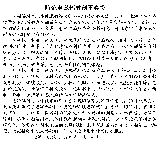 在您看電視的時候,您也許不會料到比高壓電纜所產生的電磁波還要強的電磁輻射正籠罩著您;在您用移動電話談妥一宗生意的時候,您不會想到手機天線集中釋放的電磁波已經進入了您的體內……