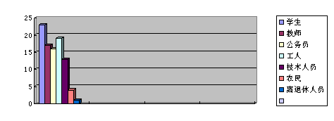調查共收回問卷 93 份,回收率為 93% 。在被調查人群中,男性 48 人,女性 45 人(圖 1 ),其中有 37 人的日常生活中與電磁波有直接的聯系,其余 56 人都不同程度的接觸電磁波(圖 2 )。在被調查的人群中,有 23 名學生, 17 名教師, 16 名公務員, 19 名工人,技術人員 13 名,農民 4 名,離(退)休人員 1 名。
